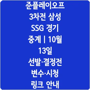 10월 13일 월요일, 저녁 6시 30분 대구 라이온즈파크에서 삼성 라이온즈와 SSG 랜더스의 준플레이오프 3차전이 개최됩니다. 양 팀 모두 1승씩을 나눠 가진 상황에서 긴장감이 넘치는 경기가 예상됩니다.